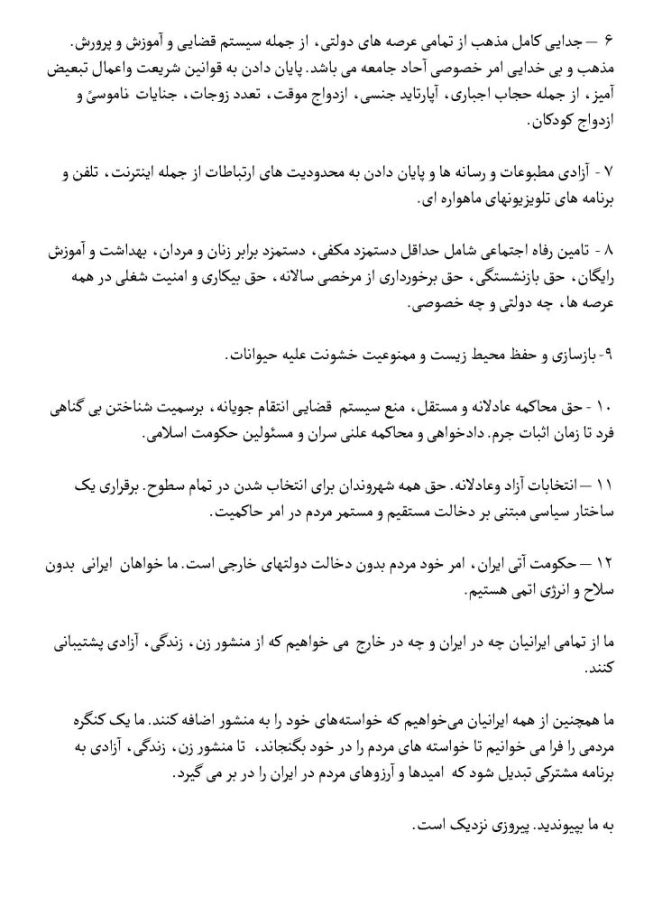 12. The future government of Iran is the matter of the people themselves without the interference of foreign governments. We want an Iran without nuclear weapons and energy.